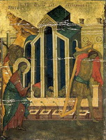 Vedz že, všetko toto, čo milosťou posvätil Svätý Duch, teraz oslavujeme, ako hovoria vyššie a osvietené hlavy, ktoré ukazujú na deväť stavov: praotcovia a patriarchovia, proroci a svätí apoštoli, mučeníci a vyznávači, hieromučeníci a prepodobnomučeníci, prepodobní a spravodliví a oslavujúce všetky sväté ženy a všetkých iných bezmenných svätých, s ktorými chceme byť a budeme. Pred všetkými, vo všetkých a so všetkými, svätú svätých, presvätú a s ostatnými anjelskými činmi neporovnateľnú, našu Pani a Vládkyňu, Bohorodičku, Máriu, vždy Pannu, na ktorej príhovor Kriste Bože a všetkých tvojich svätých, zmiluj sa nad nami a spas nás ako jediný Milostivý a človeka milujúci. Amen.