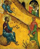 Pán prichádza do mesta Sychar a unavený z cesty si tu sadá o dvanástej hodine dňa. Nejaká žena prichádza z mesta, aby načerpala vodu a keď učeníci odišli nakúpiť niečo na jedenie, Ježiš si pýta vodu. Ona, poznajúc ho podľa prízvuku a odevu, jeho prosbu neprijíma. On ju vedie a do srdca jej prináša duchovnú vodu, ktorá sa ukazuje čistejšia a hojnejšia, podobajúca sa duchu a večnému ohňu. Žena mu povedala, že nemôže mať takú vodu, lebo nemá vedro a aj studňa je hlboká. Potom preniesla slovo aj na praotca Jakuba, ktorý vykopal túto studňu, aby z nej pil on aj jeho ovce, predložiac tu bohatý prameň a nevyhnutnú studňu. Kristus sa ale nerobil väčším ako Jakub, aby nevyľakal ženu, ale hovoril o vode, z ktorej keď bude piť, nikdy nebude žízniť. Žena si poprosila takej vody, on jej povedal, aby priniesla svojho muža. Ona odpovedala, že nemá muža. On, vediac všetko, povedal: „Správne si povedala, lebo si mala päť mužov a ten, ktorého máš teraz, šiesteho, nie je tvoj muž. Niektorí považujú piatich mužov za päť kníh Mojžišových, ktoré prijali Samaritáni a šiesteho Kristove slová, ktoré ešte neboli (povedané), pretože nebola vyliata milosť (Svätého Ducha). Iní päť zákonov daných Bohom: v raji, po vyhnaní, Noemu, Abrahámovi a Mojžišovi. Šiesty evanjelium, ktoré ešte nemala. Hovoria tiež, že aj podľa piatich zmyslov. Žena mu odpovedala, nazvúc ho prorokom. Potom sa ho spýtala na vrch, na ktorom sa treba klaňať, či na vrchu Gerazim alebo v Jeruzaleme. Samaritáni si nemysleli, že Boh nemôže byť všadeprítomný, ale prebýva iba tam, kde sa mu klaňajú, ako zjavil na vrchu Gerazim, keď tam dal svoje požehnanie. Alebo keďže tam Abrahám postavil prvý oltár Bohu, ako znova hovoria Židia, v Jeruzaleme sa treba klaňať jedinému Bohu. Preto sa tam odvtedy zhromažďujú vo sviatok. Ježiš odpovedal, že spása sveta je zo Židov a Boh je duch, a tí, čo sa mu klaňajú, sa nemajú klaňať obetami, ale v duchu a pravde, lebo jediného Boha poznajú jedine vo Svätom Duchu a Synovi, lebo On je pravda. Žena znova povedala: „Z písma viem, že príde Mesiáš zvaný Kristus.“ Ježiš odpovedal: „To som ja, čo sa rozprávam s tebou.” Samaritáni vedeli o Mesiášovi z Mojžišových kníh, osobitne stadiaľ: „Proroka vám vzbudí Pán váš Boh, z vašich bratov.“